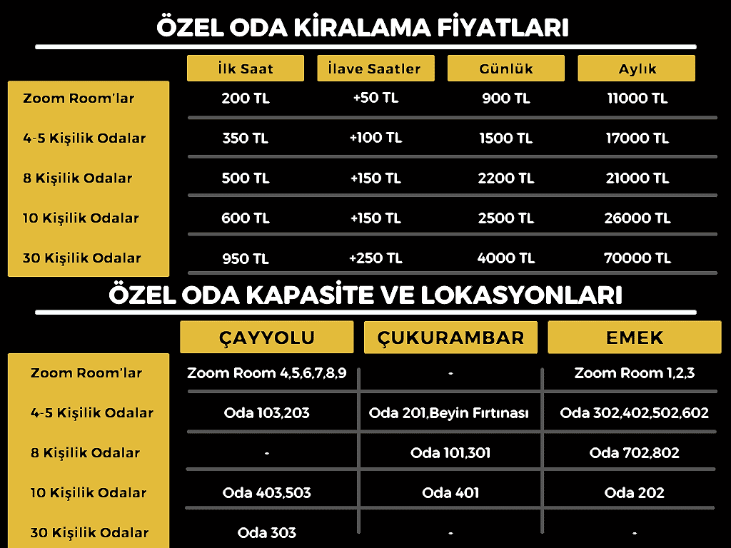 Özel oda kiralayan misafirlerimiz, ortak çalışma salonlarını kullanmayacaklarsa, Work Up günlük giriş ücretini ödemeyeceklerdir.